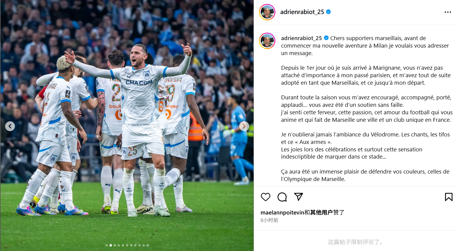 雷速体育9月11日讯 今夏拉比奥离开马赛,加盟AC米兰,拉比奥在今天更新社媒,发表了一篇长文告别马赛。正文如下亲爱的马赛球迷们,在开始我在米兰的新冒险之前,我想向你们表达我的心声。自从我抵达马里尼亚讷的第一天起,你们就未曾在意我的巴黎过往,而是立刻把我当作真正的马赛人接纳,这份情谊一直...