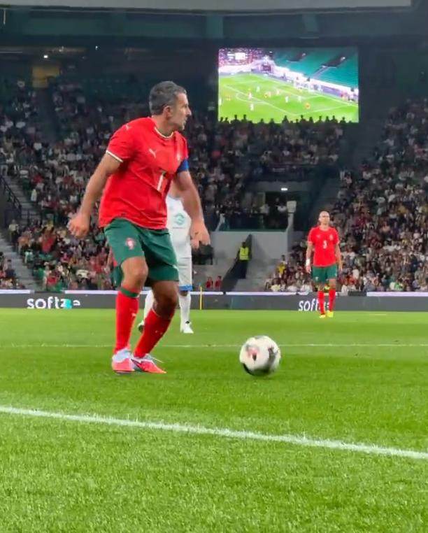 葡萄牙传奇队庆祝进球,菲戈佩戴队长袖标。比赛中,他1射1传。